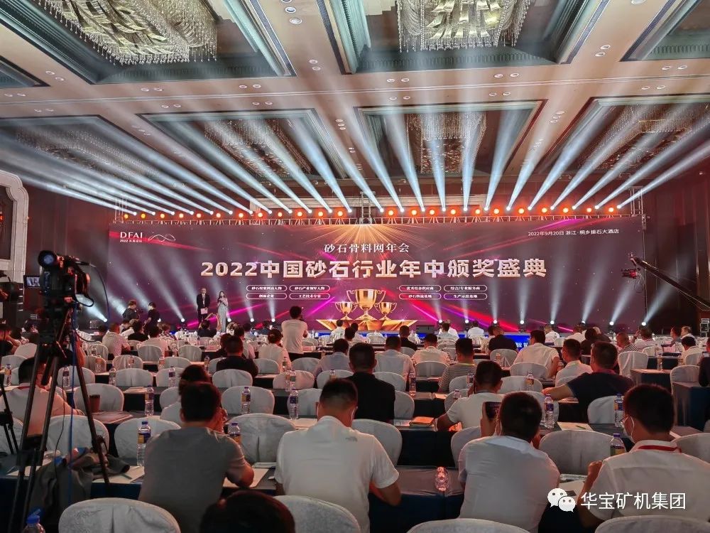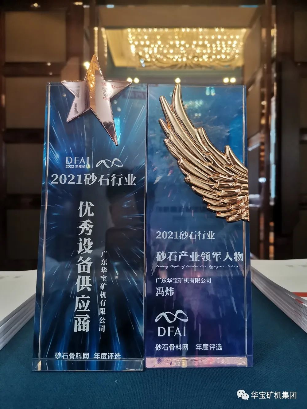 在“全國砂石產能TOP20獨家發布儀式-砂石骨料年會”頒獎活動中,華寶礦機集團董事長馮煒先生榮獲2021砂石行業“砂石產業領軍人物”的殊榮;華寶礦機集團榮獲2021砂石行業“優秀設備供應商”的榮譽稱號。