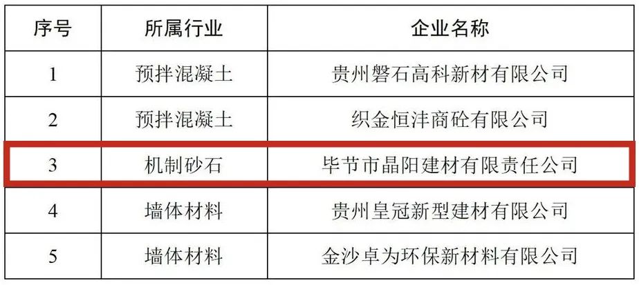 近日,貴州省工業(yè)和信息化廳發(fā)布《關(guān)于符合建材行業(yè)規(guī)范條件企業(yè)(第一批)的公示》,其中機(jī)制砂石生產(chǎn)企業(yè)——畢節(jié)市晶陽(yáng)建材有限責(zé)任公司入選貴州省建材行業(yè)規(guī)范條件認(rèn)定企業(yè)名單。