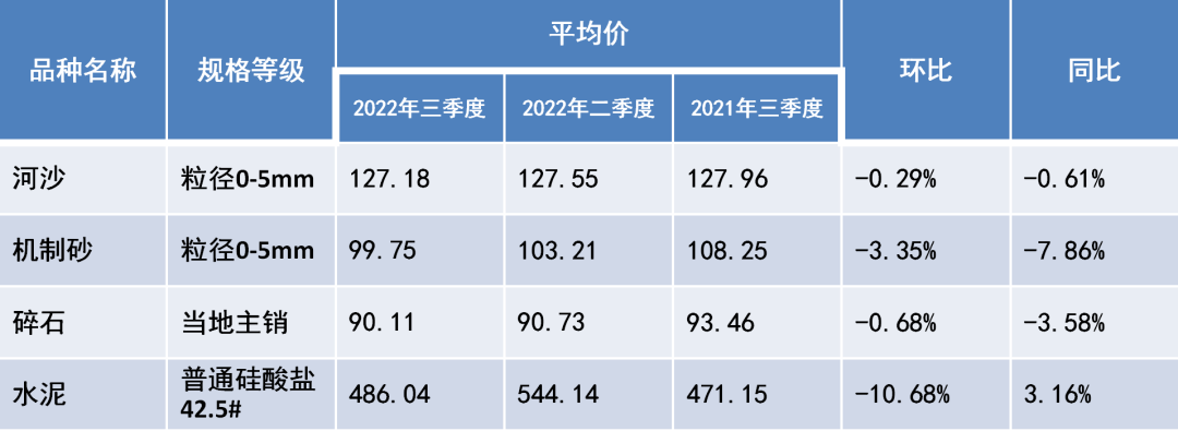 三季度江西全省河沙(粒徑0-5mm)、機(jī)制砂(粒徑0-5mm)、碎石(當(dāng)?shù)刂麂N)每噸均價分別為127.18元、99.75元、90.11元,環(huán)比分別微跌0.29%、3.35%、0.68%,同比分別下跌0.61%、7.86%、3.58%,其中9月份每噸均價分別為127.05元、99.88元、89.87元,環(huán)比分別微跌0.39%、微漲0.50%、微跌0.55%,同比分別下跌1.08%、7.27%、3.84%。