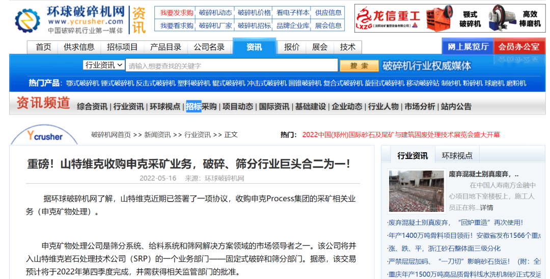 環(huán)球破碎機(jī)網(wǎng)進(jìn)行了相關(guān)報(bào)道《山特維克收購申克采礦業(yè)務(wù),