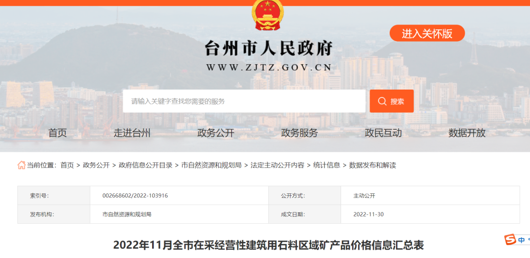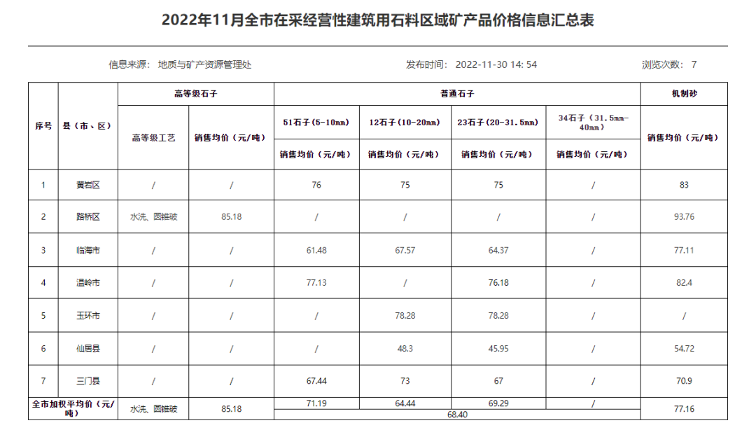 近日,浙江省臺(tái)州市人民政府發(fā)布“2022年11月全市在采經(jīng)營性建筑用石料區(qū)域礦產(chǎn)品價(jià)格信息匯總表”中顯示,11月浙江臺(tái)州砂石均價(jià),機(jī)制砂均價(jià)77.16元/噸,精品石子均價(jià)85.18元/噸,碎石均價(jià)68.40元/噸。其中51石子(5-10mm)均價(jià)71.19元/噸,12石子(10-20mm)均價(jià)64.44元/噸,23石子(20-31.5mm)均價(jià)69.29元/噸。
