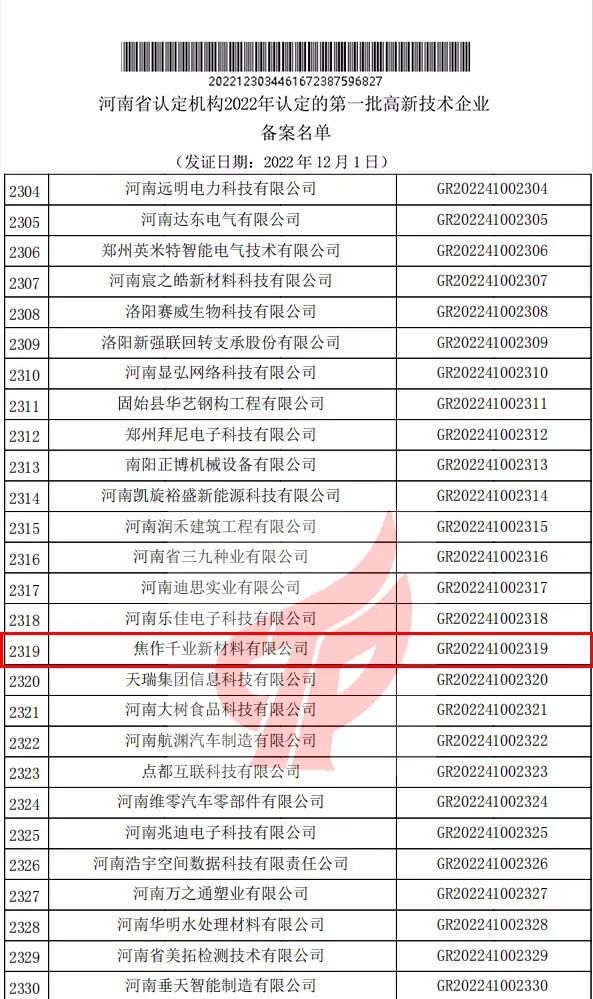 日前,全國(guó)高新技術(shù)企業(yè)認(rèn)定管理工作領(lǐng)導(dǎo)小組辦公室公布了《河南省認(rèn)定機(jī)構(gòu)2022年認(rèn)定的第一批高新技術(shù)企業(yè)備案名單》,焦作千業(yè)新材料有限公司成功入選。