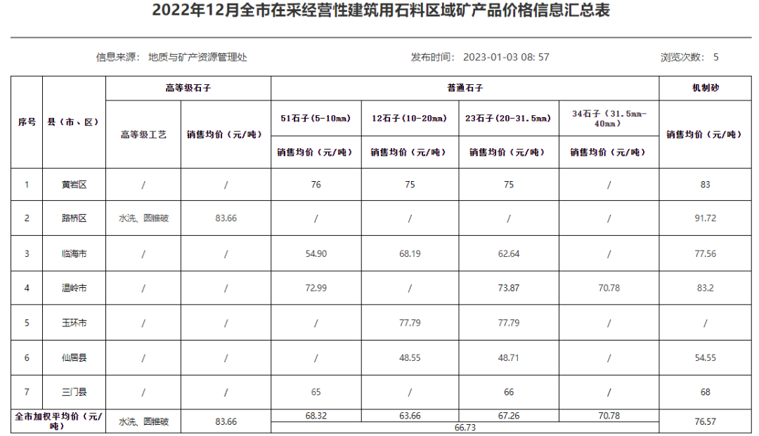 近日,浙江省臺(tái)州市人民政府發(fā)布“2022年12月全市在采經(jīng)營(yíng)性建筑用石料區(qū)域礦產(chǎn)品價(jià)格信息匯總表”中顯示,12月浙江臺(tái)州砂石價(jià)格均出現(xiàn)不同程度的下跌,機(jī)制砂均價(jià)76.57元/噸,精品石子均價(jià)83.66元/噸,碎石均價(jià)66.73元/噸。其中51石子(5-10mm)均價(jià)68.32元/噸,12石子(10-20mm)均價(jià)63.66元/噸,23石子(20-31.5mm)均價(jià)70.28元/噸。