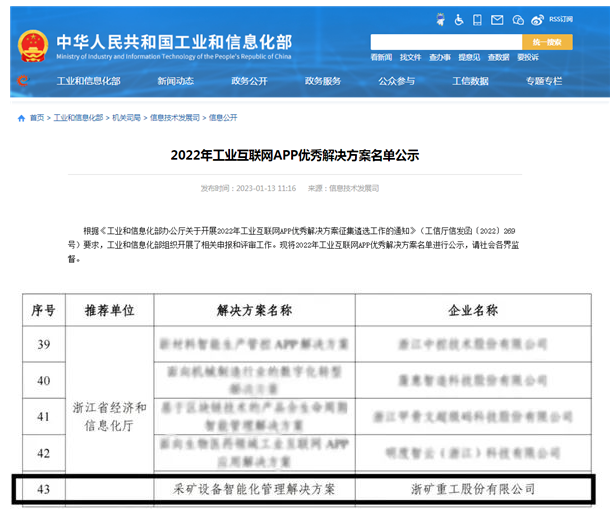 2023年1月,工信部發(fā)布《2022年工業(yè)互聯(lián)網(wǎng)APP優(yōu)秀解決方案公示名單》,浙礦重工股份有限公司(簡(jiǎn)稱:浙礦重工)研發(fā)的“采礦設(shè)備智能化管理解決方案”成功入選。