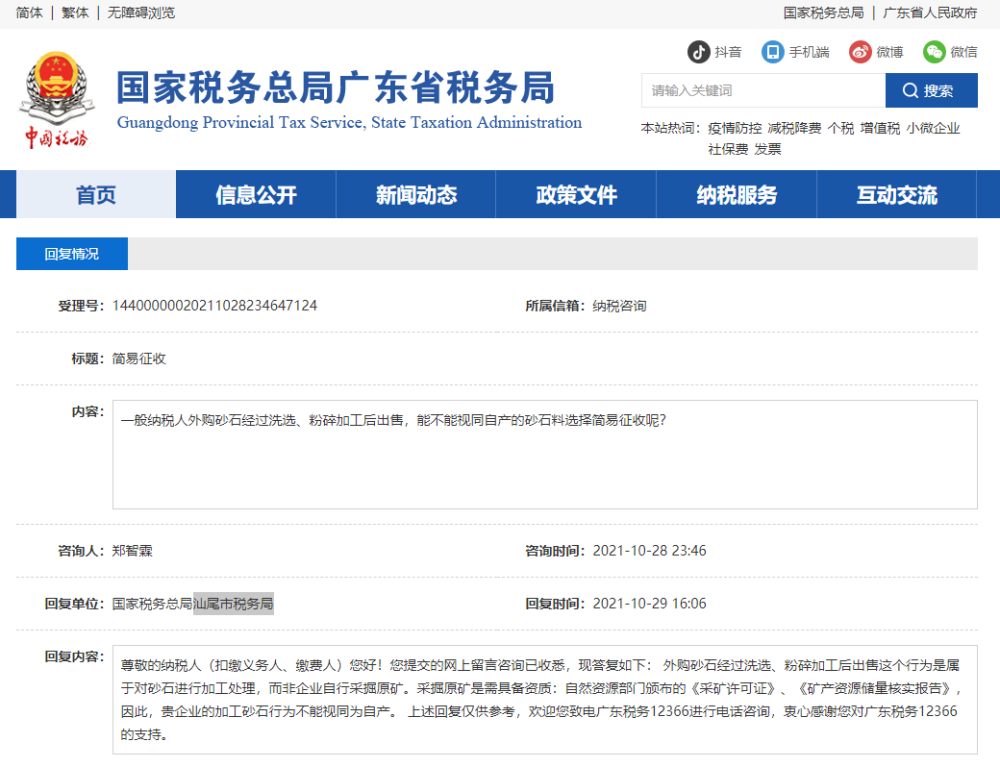 3.廣東省汕尾市稅務(wù)局回復(fù)加工外購(gòu)砂石后銷售簡(jiǎn)易計(jì)稅問(wèn)題