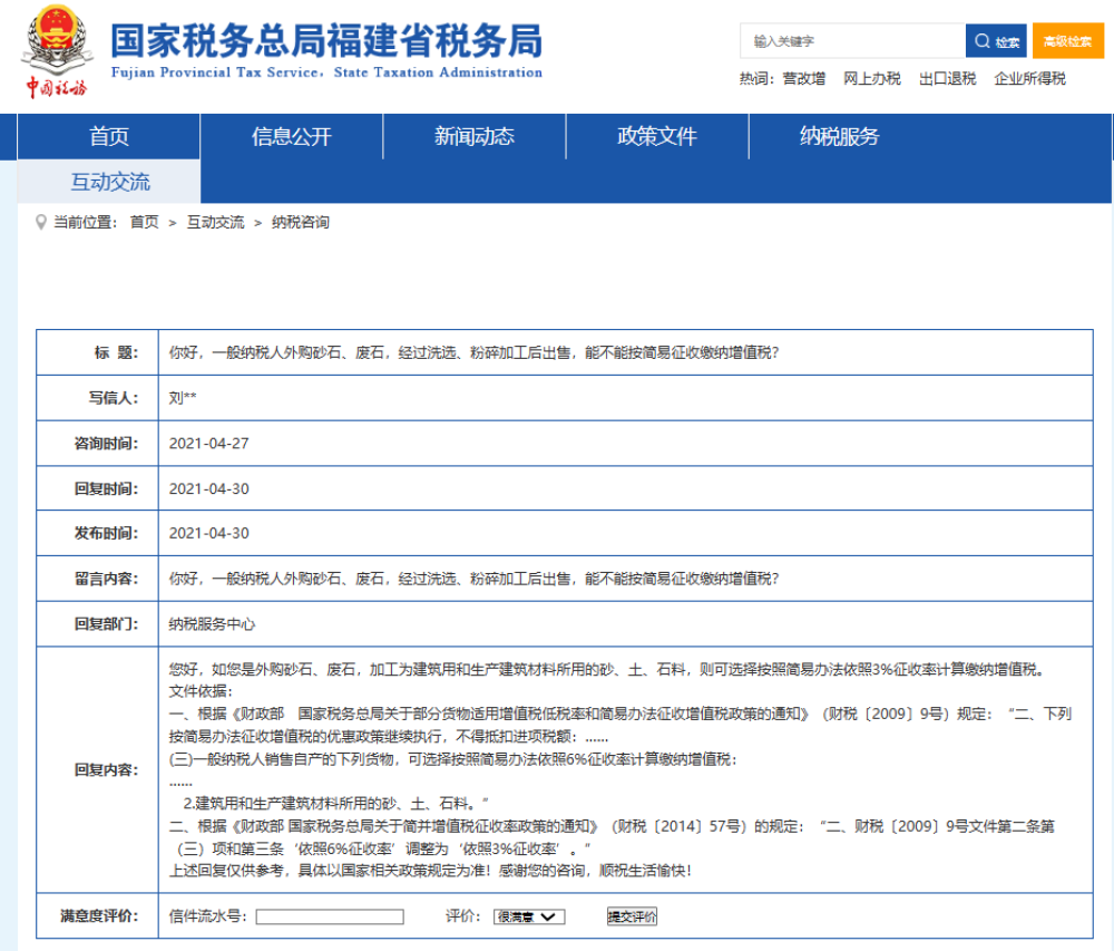 4.福建省稅務(wù)局回復(fù)加工外購(gòu)砂石后銷售簡(jiǎn)易計(jì)稅問(wèn)題