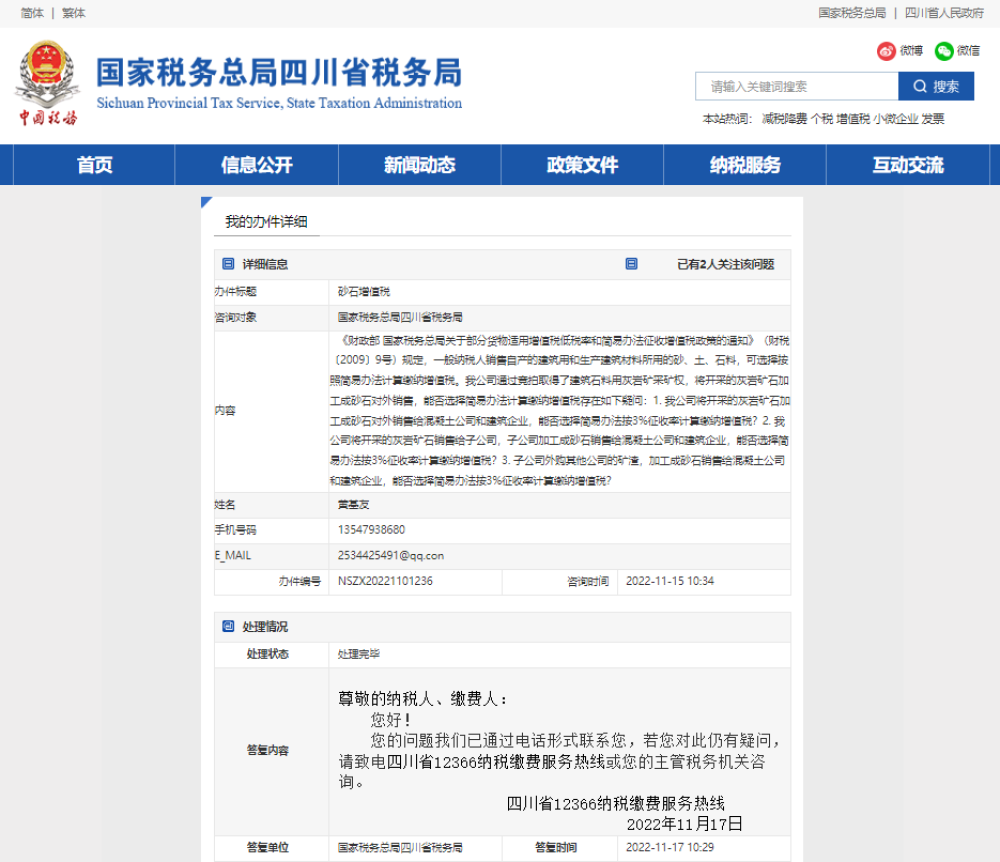 2022年11月,筆者就類似問(wèn)題向四川省稅務(wù)局留言咨詢,四川省12366納稅服務(wù)熱線電話回復(fù)筆者,上述情況只要滿足自產(chǎn)自銷的條件,砂石企業(yè)銷售以礦石為原料加工而成的自產(chǎn)機(jī)制砂石可以選擇簡(jiǎn)易計(jì)稅方法繳納增值稅。本次留言咨詢的截圖,可參見(jiàn)本文附錄1。