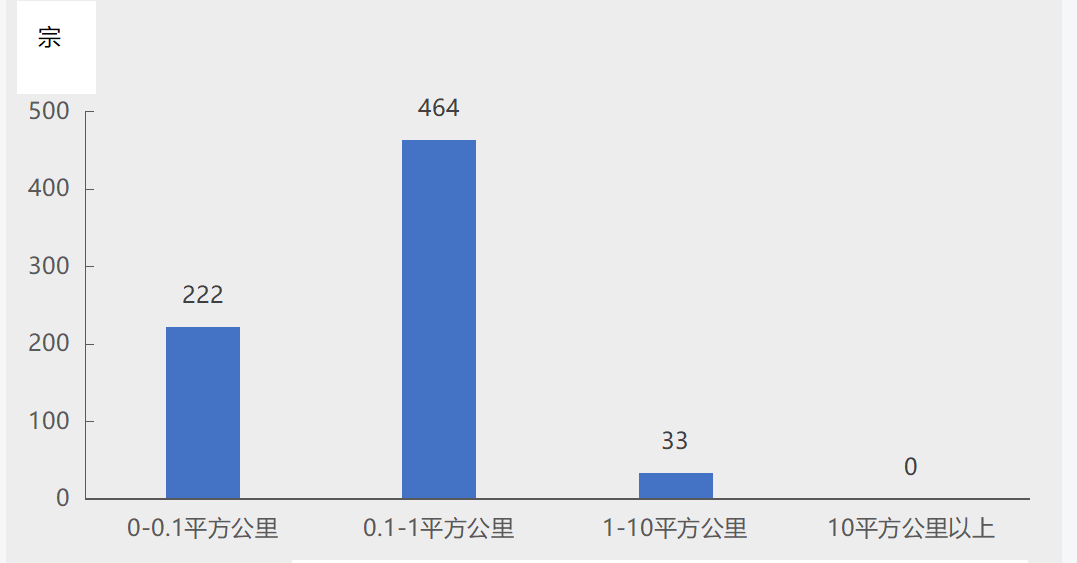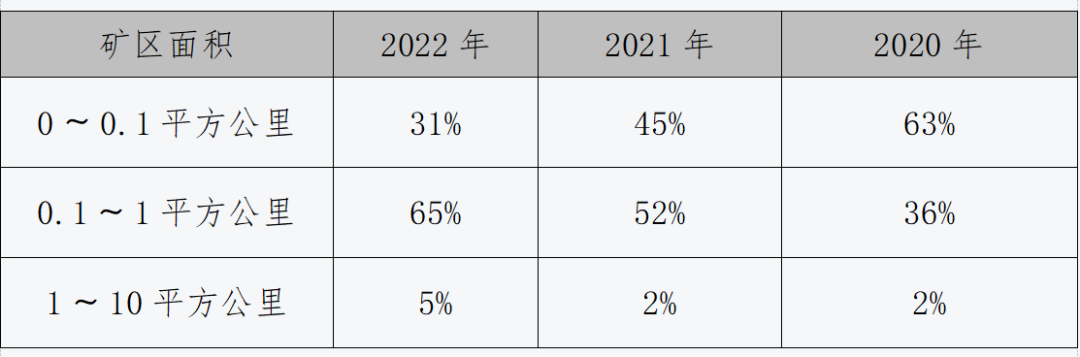 從新設砂石礦權礦區(qū)面積來看,砂石行業(yè)規(guī)模化水平進一步提升,礦區(qū)面積0.1~1平方公里之間砂石礦權占新設砂石礦權六成以上,成為新設礦權的主流。新設砂石礦權中,礦區(qū)面積在0~0.1平方公里之間的有222宗,占比為31%,占比較2021年下降14個百分點,新設小規(guī)模砂石礦權數(shù)量持續(xù)減少;礦區(qū)面積在0.1~1平方公里之間的新設砂石礦權有464宗,占比逐年提升,2022年已經(jīng)達到65%;礦區(qū)面積在1~10平方公里之間的新設砂石礦權33宗,占比為5%。