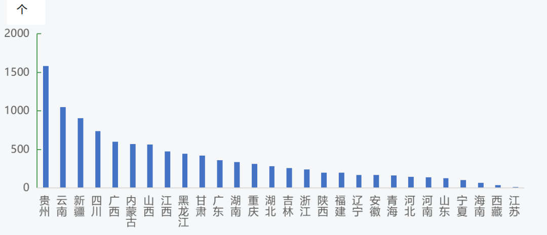 截至2021年年底,從各省(自治區(qū)、直轄市)砂石礦山的分布情況來看,貴州、云南砂石礦山數(shù)量最多,分別為1582個、1050個;新疆、四川、廣西、內(nèi)蒙古、山西砂石礦山數(shù)量為500~1000個;江西、黑龍江、甘肅、廣東、湖南、重慶砂石礦山數(shù)量為300~500個;湖北、吉林、浙江、陜西、福建、遼寧、安徽、青海、河北、河南、山東、寧夏砂石礦山數(shù)量為100~300個;海南、西藏、江蘇砂石礦山數(shù)量均在100個以內(nèi);北京、天津、上海砂石礦山數(shù)量為0。