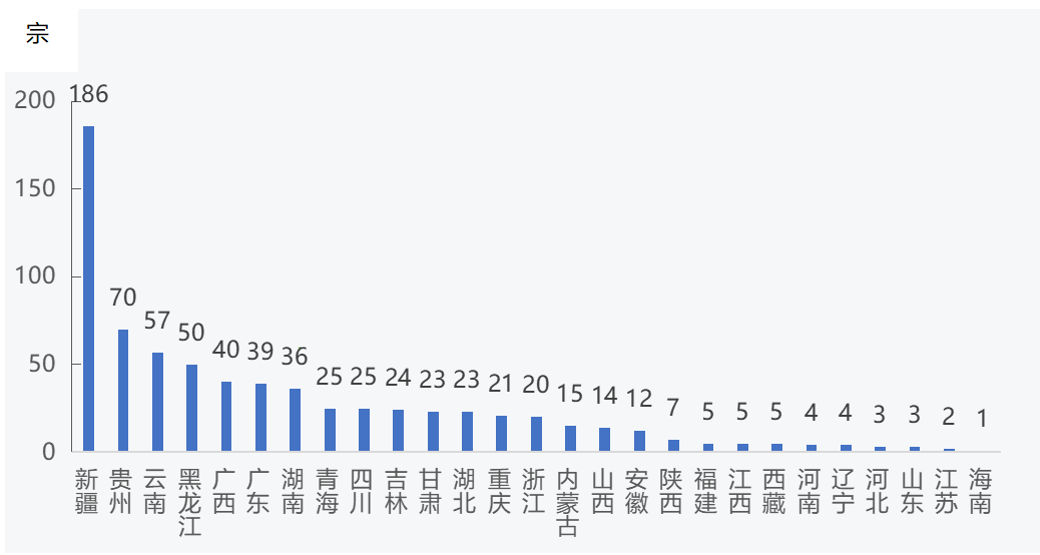 2022年,全國新設砂石礦權數(shù)量719宗,其中新疆新設砂石礦權數(shù)量最多,為186宗;貴州、云南、黑龍江新設砂石礦權數(shù)量為50~70宗;廣西、廣東、湖南新設砂石礦權數(shù)量為35~40宗;青海、四川、吉林、甘肅、湖北、重慶、浙江、內(nèi)蒙古、山西、安徽新設砂石礦權數(shù)量為10~25宗;陜西、福建、江西、西藏、河南、遼寧、河北、山東、江蘇、海南新設砂石礦權數(shù)量在10宗以內(nèi)。