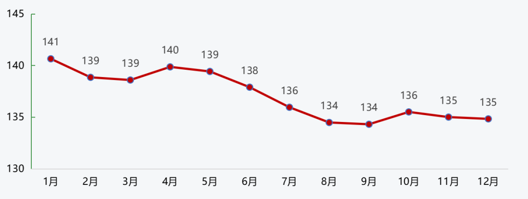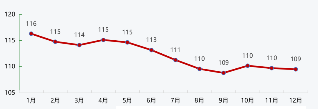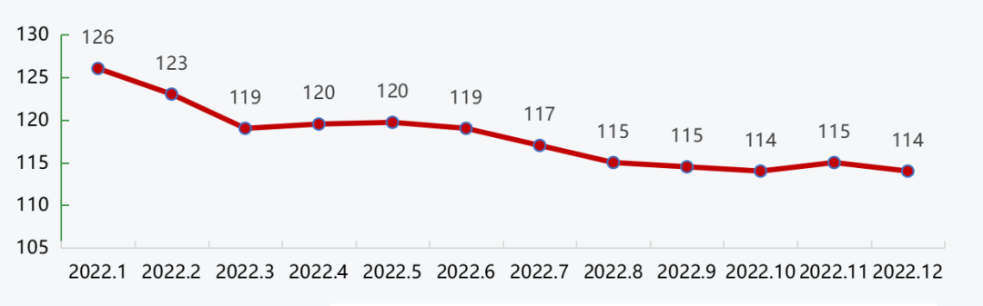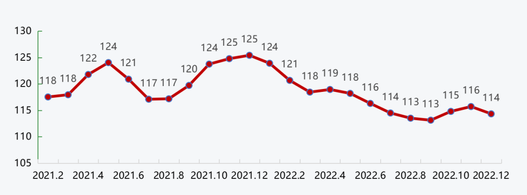 沿江城市砂石價格在年初高位運行的基礎上,受到疫情封港、下游需求不佳、沿江運費高企等因素的影響,價格持續(xù)回落,進入四季度,隨著施工旺季的到來,需求回升,價格也隨著略有回升。整體來看,2022年沿江港口砂石價格持續(xù)回落,12月降至114元/噸,較年初下降3.4%。