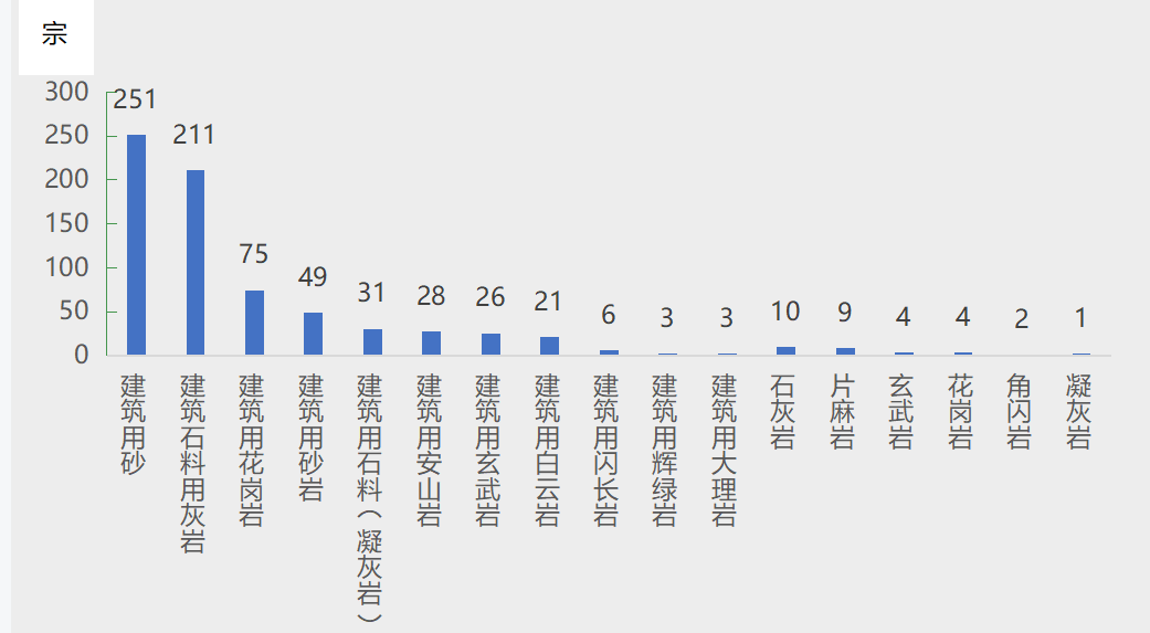 全國新設砂石礦權中,有建筑用砂、建筑石料用灰?guī)r、建筑用花崗巖、建筑用砂巖、建筑用石料(凝灰?guī)r)、建筑用安山巖、建筑用玄武巖、建筑用白云巖、石灰?guī)r、片麻巖、建筑用閃長巖、玄武巖、花崗巖、建筑用輝綠巖、建筑用大理巖、角閃巖、凝灰?guī)r17種礦種。其中建筑用砂、建筑石料用灰?guī)r兩類礦種新設數(shù)量最多,分別為251宗、211宗;建筑用花崗巖礦75宗;建筑用砂巖、建筑用石料(凝灰?guī)r)、建筑用安山巖、建筑用玄武巖、建筑用白云巖五類礦種新設數(shù)量在20~50宗;建筑用閃長巖、建筑用輝綠巖、建筑用大理巖三類礦種新設數(shù)量在10宗以內(nèi);另外,新設10宗石灰?guī)r礦、9宗片麻巖礦、4宗玄武巖礦、4宗花崗巖礦、2宗角閃巖礦、1宗凝灰?guī)r礦。