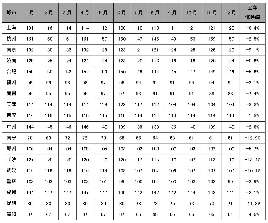 全國重點城市2022年砂石行情月度變化表(元/噸)