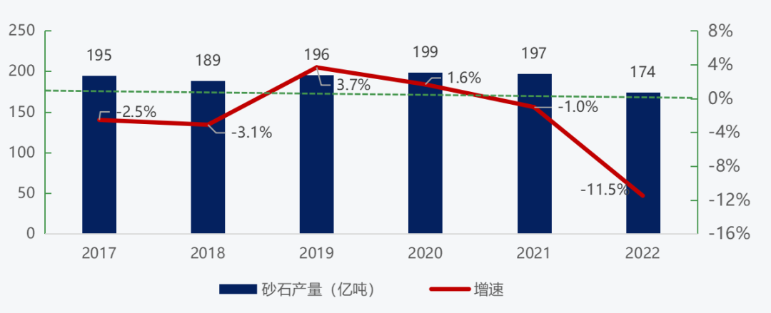 2022年砂石供需總體偏弱,供給端:產(chǎn)線開機率、產(chǎn)能利用率整體偏低;需求端:砂石需求收縮。從供需關系來看,2022年全年砂石處于供大于求的狀態(tài),企業(yè)庫存保持高位。全國砂石產(chǎn)量174.2億噸,較2021年下降11.5%。