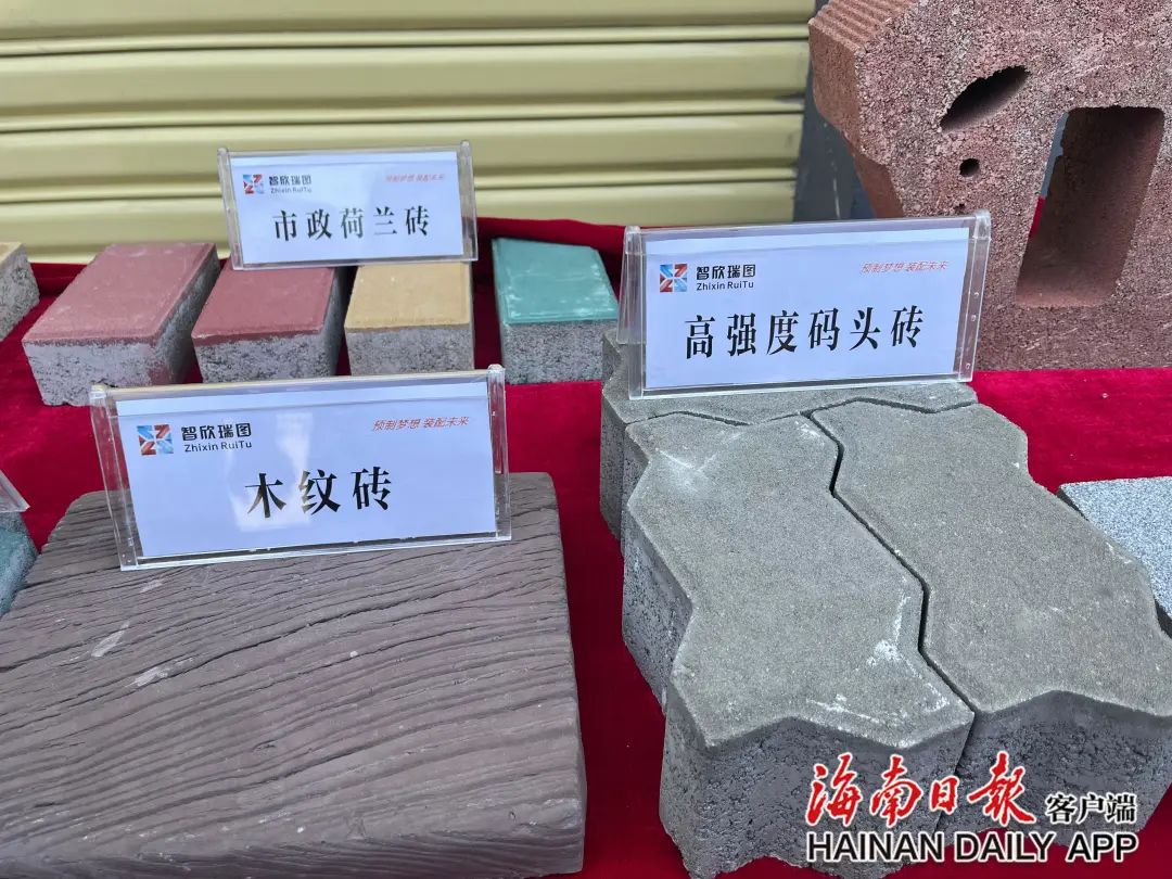 在生產(chǎn)車間外,瑞圖明盛環(huán)保建材(昌江)有限公司總經(jīng)理郭建明向記者展示了經(jīng)過多道工藝處理過后的成品。“這塊由鐵礦、水泥廢渣廢料加工而成的新型地磚,透水性好、抗壓強度高、壽命長,不僅美觀,還能起到蓄水的作用,正符合海綿城市建設(shè)的要求。”