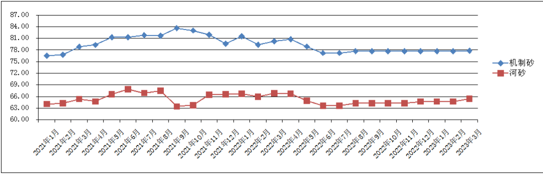 3月份,甘肅省砂石平均出廠價(jià)格機(jī)制砂(細(xì)砂)每噸77.78元,河砂(細(xì)砂)每噸65.45元,環(huán)比分別上漲0.12%、1.16%;同比,機(jī)制砂、河砂分別下降3.04%、2.05%。