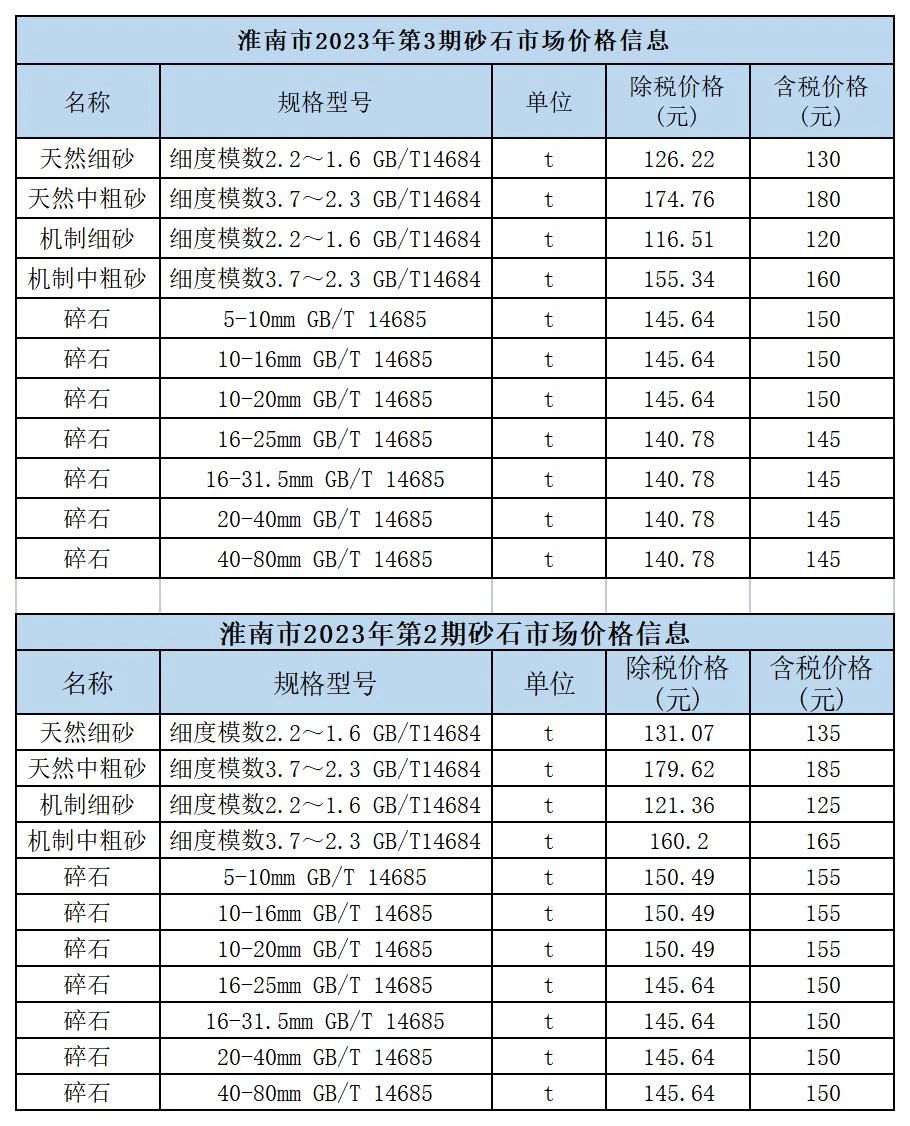 2023年3月份,安徽淮南天然細砂含稅價格130元/噸、天然中粗砂含稅價格180元/噸、機制細砂含稅價格120元/噸、機制中粗砂含稅價格160元/噸、碎石5-10mm含稅價格150元/噸、碎石20-40mm含稅價格145元/噸。相比2月份,價格均下降5元/噸。