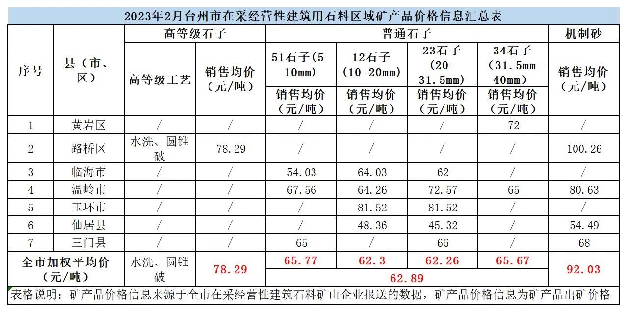 2023年3月份,浙江臺州高等石子均價82.18元/噸、普通石子均價63.33元/噸、機制砂均價77.63元/噸;相比2月高等石子均價78.29元/噸、普通石子均價62.79元/噸、機制砂均價92.03元/噸。其中,機制砂下跌幅度最大約15元/噸。