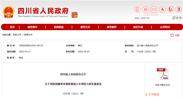 據(jù)了解,該《意見》是繼2023年1月份,中共四川省委、四川省人民政府出臺的《關(guān)于進(jìn)一步加強水利工程建設(shè)保障經(jīng)濟(jì)社會高質(zhì)量發(fā)展的意見》后的又一推進(jìn)水利工程建設(shè)的利好政策。