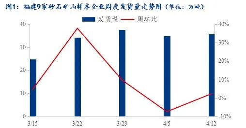 據(jù)調(diào)研福建9家砂石企業(yè)生產(chǎn)情況來(lái)看,本周砂石出貨量共35.6萬(wàn)噸,較上周增加0.8萬(wàn)噸,環(huán)比提升2%。