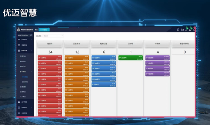 2022年起,騰遠(yuǎn)煤礦采用西安建大優(yōu)邁自主研發(fā)的“智慧礦山綜合管控系統(tǒng)”全面開(kāi)展智能礦山建設(shè)。使用卡車(chē)集群協(xié)同智能調(diào)度系統(tǒng)實(shí)時(shí)跟蹤卡車(chē)、挖掘機(jī)作業(yè)狀態(tài),根據(jù)生產(chǎn)計(jì)劃作業(yè)要求,構(gòu)建全礦智能調(diào)度“超級(jí)大腦”,實(shí)時(shí)進(jìn)行調(diào)度優(yōu)化模型計(jì)算,選擇最優(yōu)路徑,全局或局部車(chē)流規(guī)劃,自動(dòng)發(fā)出調(diào)度指令。作業(yè)人員或無(wú)人設(shè)備利用移動(dòng)終端實(shí)時(shí)接收調(diào)度指令,通過(guò)移動(dòng)APP自動(dòng)導(dǎo)航至作業(yè)位置,系統(tǒng)動(dòng)態(tài)跟蹤反饋?zhàn)鳂I(yè)執(zhí)行狀態(tài),自動(dòng)完成車(chē)數(shù)計(jì)量,優(yōu)化了車(chē)鏟配比,設(shè)備作業(yè)效率大幅提高。
