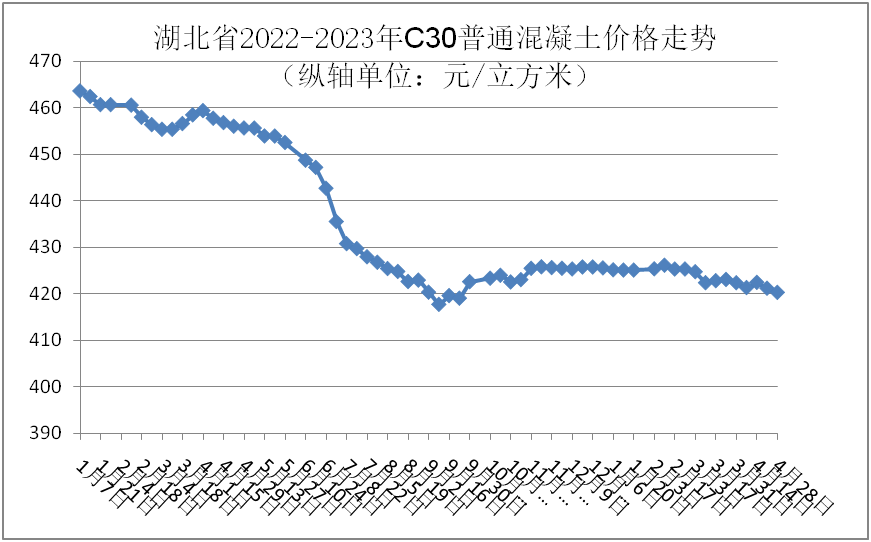 監(jiān)測數(shù)據(jù)顯示:4月份,強度等級C30普通混凝土全省均價為421.24元/立方米,環(huán)比下跌0.42%,同比下跌7.84%。
