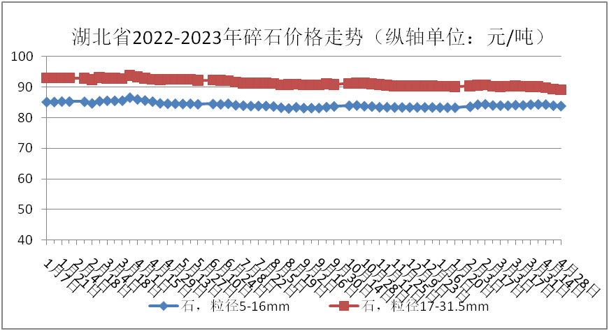 監(jiān)測數(shù)據(jù)顯示:4月份,碎石(粒徑5-16mm)、碎石(粒徑17-31.5mm)全省均價分別為84.20元/噸、89.62元/噸,環(huán)比上漲0.05%和下跌0.68%;同比分別下跌:1.32%和3.40%。具體價格走勢情況如下圖: