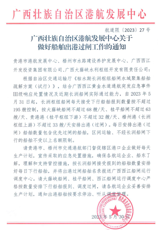 廣西壯族自治區(qū)港航發(fā)展中心發(fā)布《關于做好船舶出港過閘工作的通知》(以下簡稱《通知》),《通知》表示自2023年5月31日起,長洲樞紐船閘每天接受下行船舶報到數量按不超過195艘控制,按大藤峽船閘不超過68艘/天、桂平船閘不超過63艘/天、貴港港(桂平樞紐下游) 不超過32艘/天、梧州港(長洲樞紐上游)不超過33艘/天安排出港(過閘)。每日安排出港(過聞) 船舶數量包含優(yōu)先過閘的船舶,區(qū)間運輸、不經長洲船閘下行的船舶不受以上名額限制。