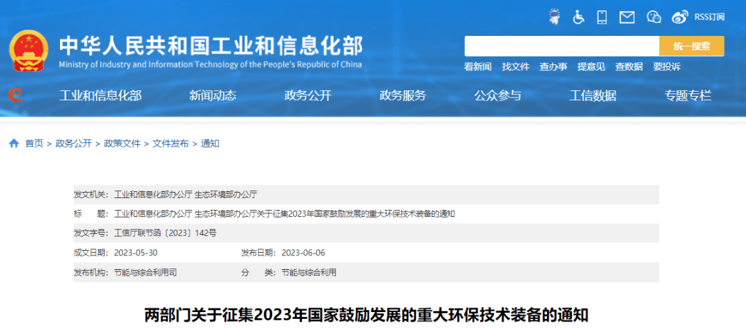 關(guān)于征集2023年國家鼓勵發(fā)展的重大環(huán)保技術(shù)裝備的通知工信廳聯(lián)節(jié)函〔2023〕142號
