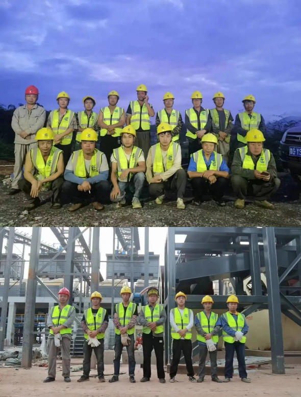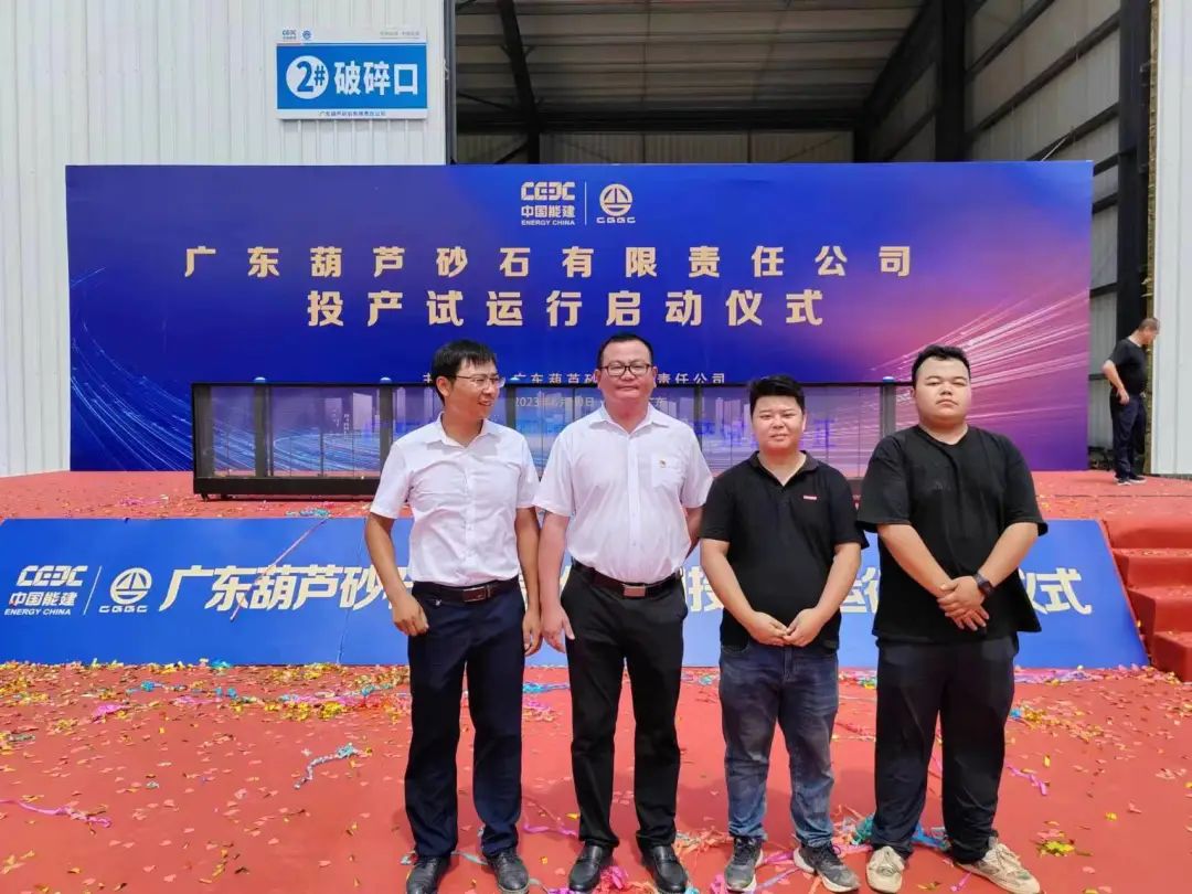 (廣東葫蘆砂石公司項(xiàng)目部副總經(jīng)理鐘劍(左一)、廣東葫蘆砂石公司董事長梅涵(左二)與承誠科技大區(qū)經(jīng)理宋超、羅煒親切合影)