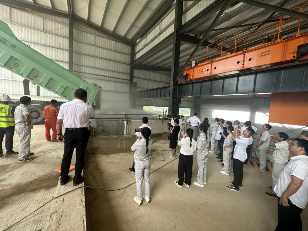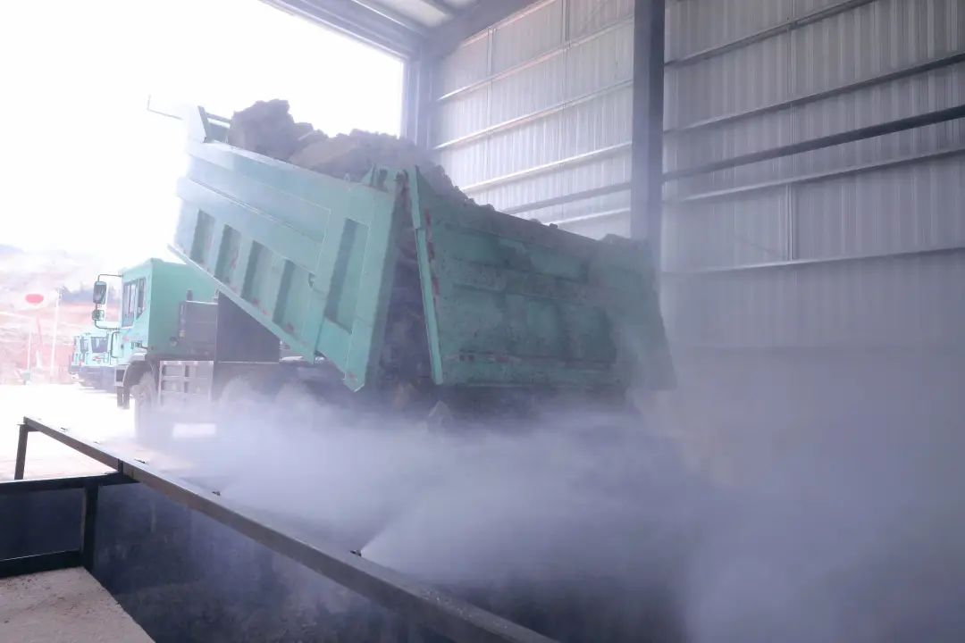 (卡車卸料時(shí),高壓噴霧系統(tǒng)通過感應(yīng)自動(dòng)開啟抑塵措施,即使距離如此近也不需要戴口罩)