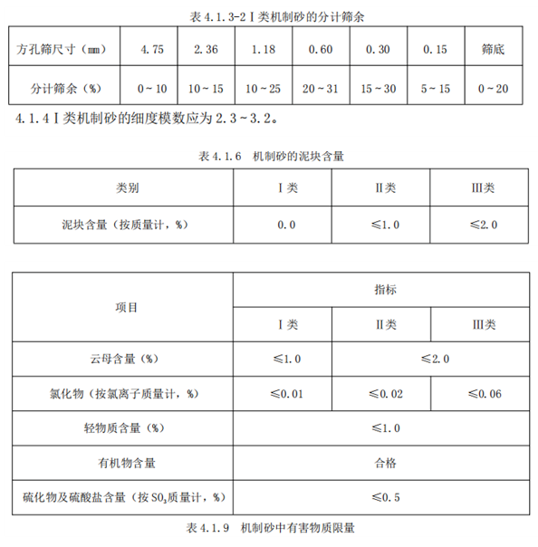 強(qiáng)度等級(jí)大于或等于C60的混凝土和高性能混凝土宜用Ⅰ類(lèi)砂、強(qiáng)度等級(jí)C30~C55的混凝土宜用Ⅰ類(lèi)、Ⅱ類(lèi)砂、強(qiáng)度等級(jí)小于等于C25的混凝土宜用Ⅰ類(lèi)、Ⅱ類(lèi)、Ⅲ類(lèi)砂。Ⅰ類(lèi)、Ⅱ類(lèi)、Ⅲ類(lèi)機(jī)制砂可用于各強(qiáng)度等級(jí)砂漿。
