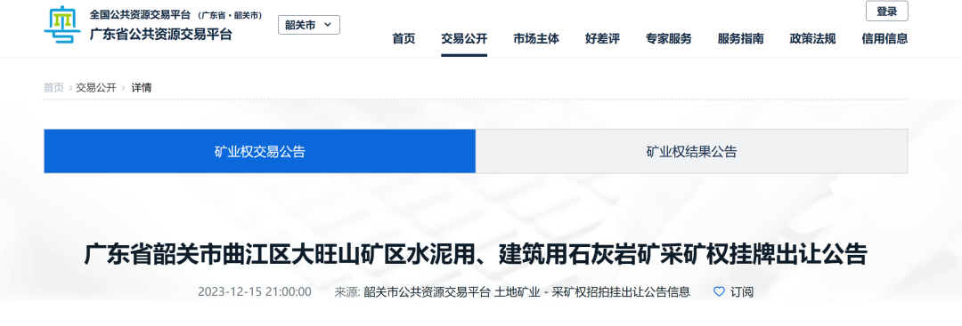 1、采礦權名稱:廣東省韶關市曲江區大旺山礦區水泥用、建筑用石灰巖礦水泥用石灰巖礦:資源量5383.51萬立方米(控制+推斷),其中控制資源量2899.01萬立方米,推斷資源量2484.50萬立方米。建筑用石灰巖礦:資源量5236.73萬立方米(控制+推斷),其中控制資源量2920.28萬立方米,推斷資源量2316.45萬立方米。根據經評審通過的《礦產資源開發利用方案》,擬設礦區剝采比為0.03∶1,確定的可采儲量如下:可采剝總量Q1=9666.55萬立方米。出讓公告時間:2023年12月15日至2024年1月15日網上報名時間:2024年1月16日8時至2024年1月30日17時止;網上掛牌時間:2024年1月16日8時至2024年1月31日17時止。1.具有獨立企業法人資格的企業(法律另有規定除外),但被列入失信企業名單的企業、被列入礦業權人異常名錄或嚴重違法名單的企業,未按照批準的礦山地質環境保護與土地復墾方案履行礦山治理與復墾義務的企業或在礦山關閉、閉坑前未完成礦山治理與復墾的企業和法人不得參加競買。2.本次網上掛牌出讓只接受單獨競買,不接受聯合競買。3.競買申請人為中華人民共和國境內注冊登記的營利法人,注冊資本不低于10000萬元,若競得人為非本地注冊登記的企業,須在簽訂《成交確認書》后的30個自然日內,在曲江轄區內的市場監督管理部門注冊成立獨立核算的全資子公司開發運營該礦山。外商投資的,還應符合《外商投資準入特別管理措施(負面清單)》的有關要求。4.競買申請人須提供中華人民共和國境內銀行或其分支機構出具的人民幣80000萬元(含)以上的銀行貸款意向書(掛牌報價之日起兩年內有效)或人民幣80000萬元(含)以上的存款證明文件。1.有意競買人可在韶關市公共資源交易中心索取資料,亦可直接登陸到廣東省公共資源交易平臺(韶關市)https://ygp.gdzwfw.gov.cn/ggzy-portal/#/440200/index、韶關市公共資源交易一體化平臺https://portal.ythpt.sg.gov.cn/下載。2.競買人須先行攜帶相關有效證件、資料前往韶關市公共資源交易中心一號樓辦事大廳申請辦理CA數字證書。只有辦理了CA數字證書的競買人,才能登錄交易系統參與網上交易活動。3.有意競買人應在報名截止前登錄廣東省公共資源交易平臺(韶關市)https://ygp.gdzwfw.gov.cn/ggzy-portal/#/440200/index、韶關市公共資源交易一體化平臺https://portal.ythpt.sg.gov.cn/(請使用360瀏覽器「極速模式」),在用戶登錄窗口使用CA數字證書登錄。登錄成功后,點擊“自然資源交易系統”進入自然資源交易系統(以下簡稱交易系統),按交易系統的要求完成申請報名手續。4.有意競買人網上報名時應按照交易系統提示申請報名。有意競買人必須保證在交易系統填寫資料的真實性,并保證書面申請材料與在交易系統填寫材料一致。5.交易系統確認有意競買人提交的信息后,自動授予有意競買人競價資格,未提交承諾書或承諾書不符合要求的取消競買資格。(一)本次采礦權網上掛牌出讓按照“符合條件者,價高者得”原則確定競得人,設起始價,不設底價,競價增幅為500萬元或其整數倍。(三)獲得競價資格的競買人須在規定的時間內進行網上競價,否則視作自動放棄競買的權利。(四)獲得競價資格的競買人必須使用CA數字證書直接登錄廣東省公共資源交易平臺(韶關市)https://ygp.gdzwfw.gov.cn/ggzy-portal/#/440200/index、韶關市公共資源交易一體化平臺https://portal.ythpt.sg.gov.cn/,在用戶登錄窗口使用CA數字證書登錄。登錄成功后,點擊“自然資源交易系統”進行網上競價。(五)網上競價期間,獲得競價資格的競買人的出價有效與否,由交易系統自行判斷。請獲得競價資格的競買人自行做好準備,及時檢查所使用的計算機設備,若獲得競價資格的競買人計算機設備遭遇網絡安全事故(包括黑客攻擊、病毒入侵等)、網絡堵塞和系統硬件故障等導致不能正常登錄交易系統進行網上報價、限時競價的,后果由競買人自行承擔。(六)競買人登陸廣東省公共資源交易平臺(韶關市)https://ygp.gdzwfw.gov.cn/ggzy-portal/#/440200/index、韶關市公共資源交易一體化平臺https://portal.ythpt.sg.gov.cn/,進入交易系統報價頁面按要求報價;交易系統確認報價后,自動更新網上交易價格,并繼續接受新的有效報價,新報價在起始價或原報價的基礎上不低于增價幅度。交易截止時(競買人進入交易大廳后,頁面顯示“現場時間”、“網上掛牌開始時間”“網上掛牌截止時間”等,顯示的時間均以服務器的時間為準),按“符合條件者,價高者得”的原則自動確定競得人。(七)在交易截止前5分鐘內,仍有競買人提出新的更高有效報價的,系統自動進入限時競價程序。限時競價是以各競買人的最新有效報價時間為起始時間,交易系統限時在5分鐘內接受競買人的新報價,每接受一次新的有效報價,交易系統將限時競價截止時間順延5分鐘,如在限時5分鐘內無人再報價,交易系統將以最后的有效報價確定為最高報價,其報價者確定為競得人,同時停止接受報價。(八)網上報價期限截止,交易系統根據下列條件確定網上交易是否成交并在相關信息欄中顯示交易結果,或者轉入網上限時競價程序:1.在交易期限內只有一個競買人報價,有底價的,不低于底價的最高報價者為競得人;無底價的,其報價不低于起始價的最高報價者為競得人;2.在交易期限內(包括限時競價)有兩個或以上競買人報價的,報價最高者為競得人,但低于底價者除外;3.在網上競價期限內,無人應價或者競買人的報