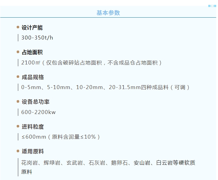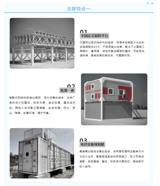 300T模塊化集成環(huán)保破碎站 300T模塊化集成環(huán)保破碎站,采用高度模塊化、集成化、系統(tǒng)化工藝設(shè)計,將分散的破碎、篩分、環(huán)保設(shè)備,整合成一個破碎站。極大程度降低項目占地面積、土建施工量、廠房建設(shè)和安裝時間,兼具固定破碎站的穩(wěn)定性和移動破碎站的便捷性。讓砂石骨料破碎生產(chǎn)線建設(shè),如同采購單機設(shè)備一樣簡單、快捷。 配置靈活:破碎站采用高度集成化機罩一體式模塊設(shè)計,擴展性強,各模塊可進(jìn)行靈活匹配,以滿足客戶不同需求。 安裝便捷:破碎站采用全鋼結(jié)構(gòu)模塊設(shè)計,兼?zhèn)涔潭ㄆ扑檎镜姆€(wěn)定性和移動站的便捷性。 綠色環(huán)保:破碎站采用創(chuàng)新空氣導(dǎo)流設(shè)計,匹配除塵或污水處理系統(tǒng),滿足國家現(xiàn)行環(huán)保要求。 節(jié)省投資:客戶僅需完成場地“三通一平”即可,減少基礎(chǔ)建設(shè)、廠房建設(shè)等費用。 運輸方便:控制室采用國際通用運輸單元,整裝、整運,方便快捷。