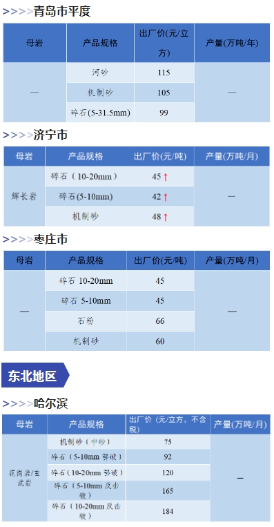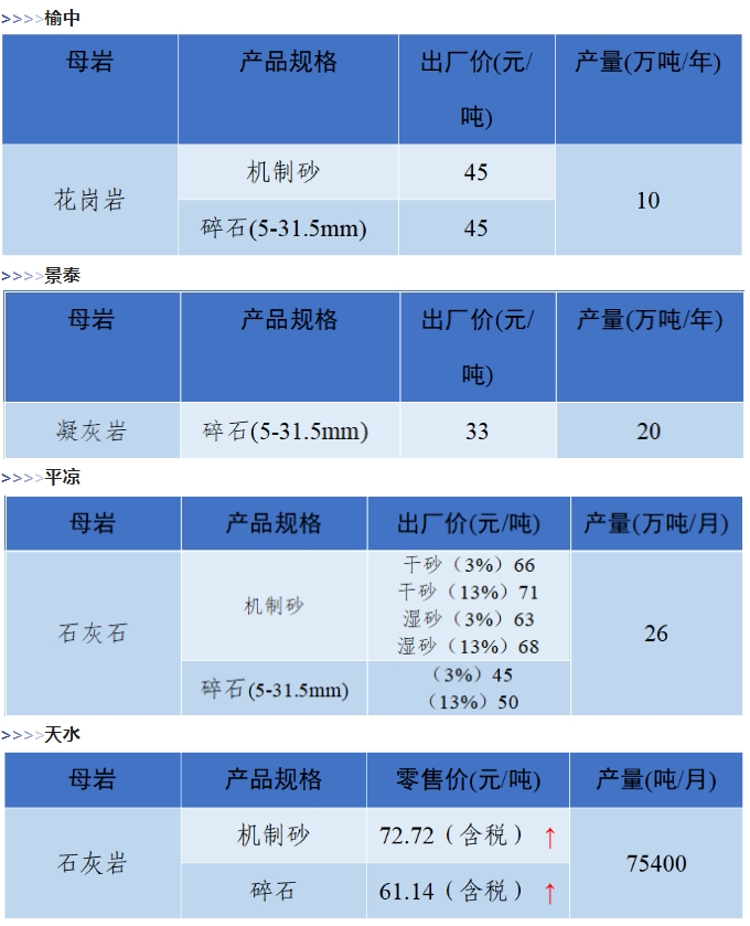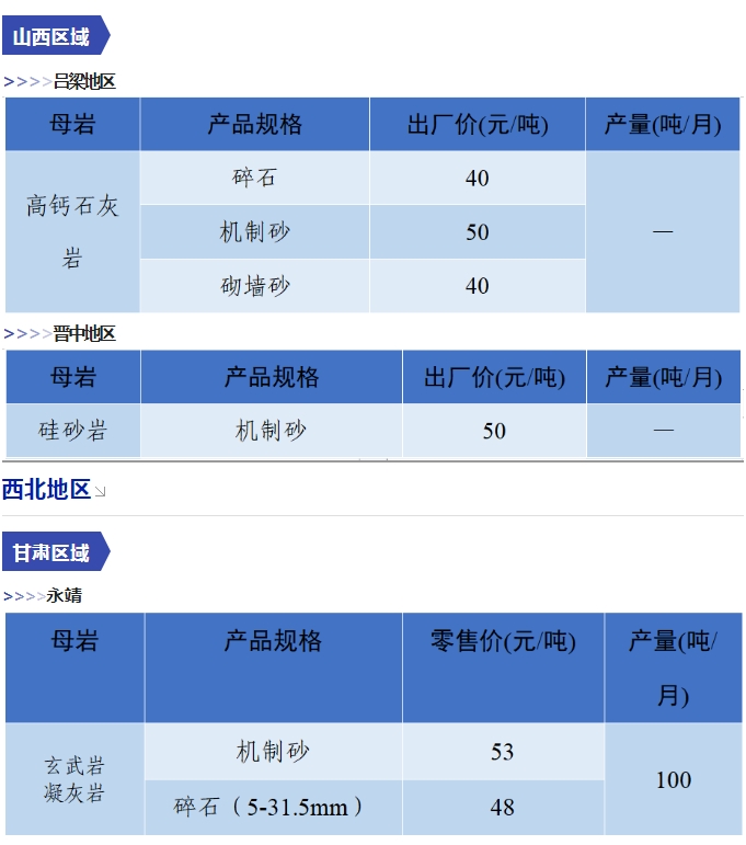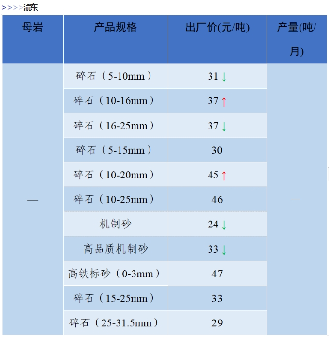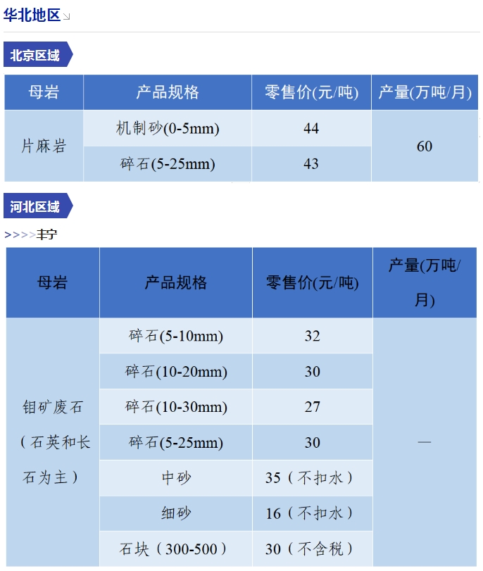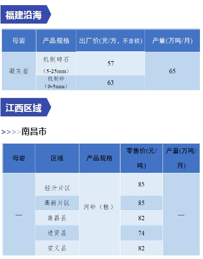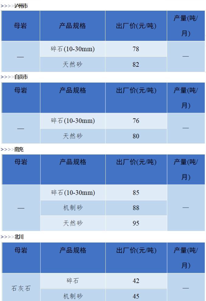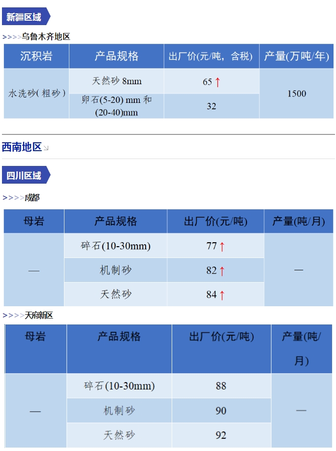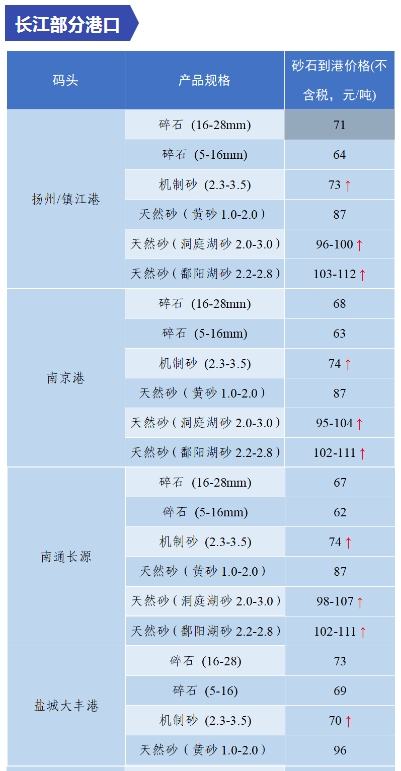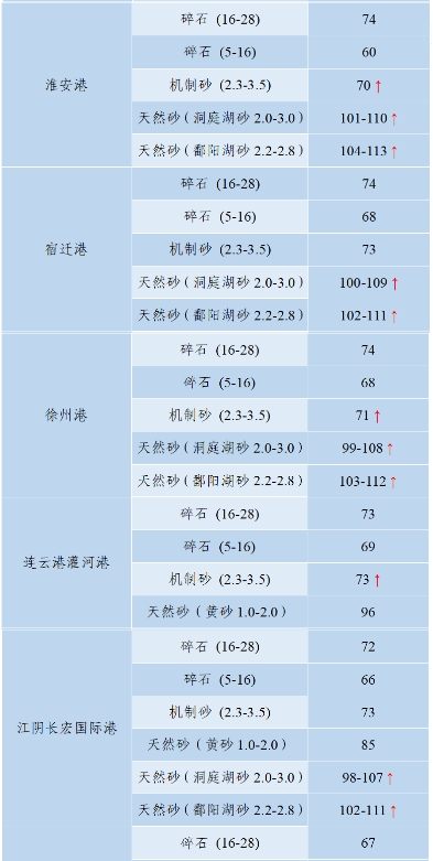 上漲 成都碎石77元/噸,上漲2元/噸,機制砂82元/噸,上漲2元/噸,天然砂82元/噸,上漲2元/噸。 甘肅天水市機制砂72.12(含稅),上漲11元/噸,碎石61.14元/噸,上漲6元/噸。 湖南長沙高標(biāo)碎石92元/噸,上漲3元/噸;機制砂85元/噸,上漲7元/噸。 長江沿線港口機制砂石、洞庭湖、鄱陽湖砂全線上漲,普遍漲幅在2-4元/噸左右。南京港天然砂(洞庭湖砂2.0-3.0)95-104元/噸,上漲5-8元/噸;南通長源(洞庭湖砂2.0-3.0)98-107/噸,上漲5-12元/噸。 下降 重慶渝東碎石(5-10mm)31元/噸,下降2元/噸;碎石(16-25mm)37元/噸,下降3元/噸;機制砂24元/噸,下降3元/噸,高品質(zhì)機制砂33元/噸,下降8元/噸。 重慶渝北機制砂48元/噸,下降6元/噸,高品質(zhì)機制砂54元/噸,下降6元/噸,碎石(5-10mm)45元/噸,下降6元/噸。 溫馨提示:部分價格為相關(guān)企業(yè)代表性價格,不代表當(dāng)?shù)仄骄鶅r格,價格僅供參考。 臨近年關(guān),部分礦山開始停產(chǎn)停運,除大型基建項目趕工外,其他項目已經(jīng)進(jìn)入收尾階段,北方部分項目逐步進(jìn)入“停工”階段,請相關(guān)企業(yè)關(guān)注砂石價格和市場走向,根據(jù)自身實際情況合理安排生產(chǎn)和采購任務(wù)。