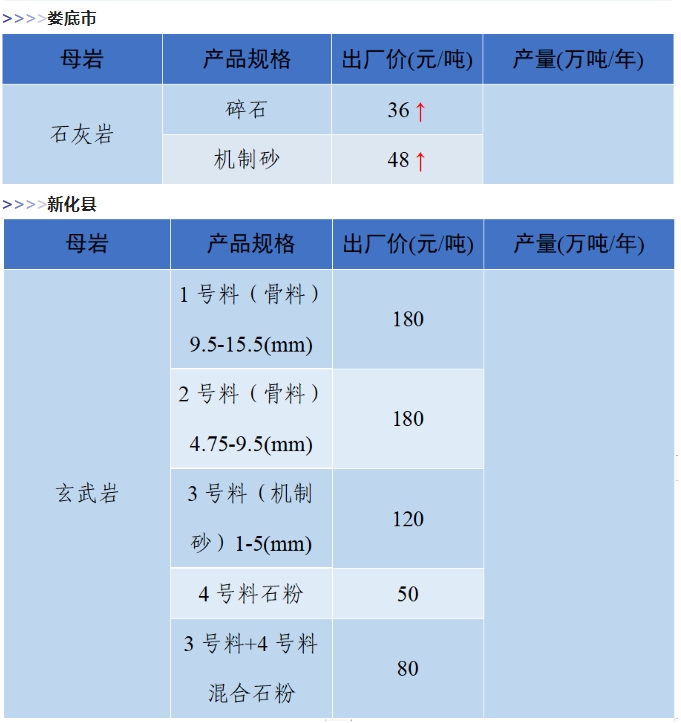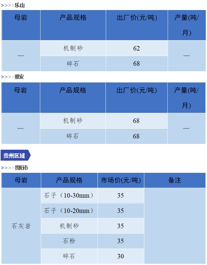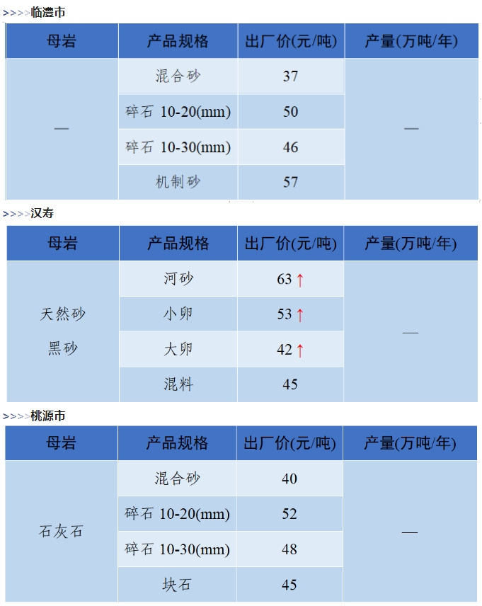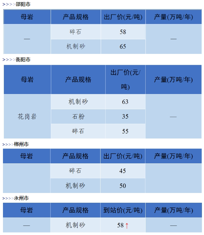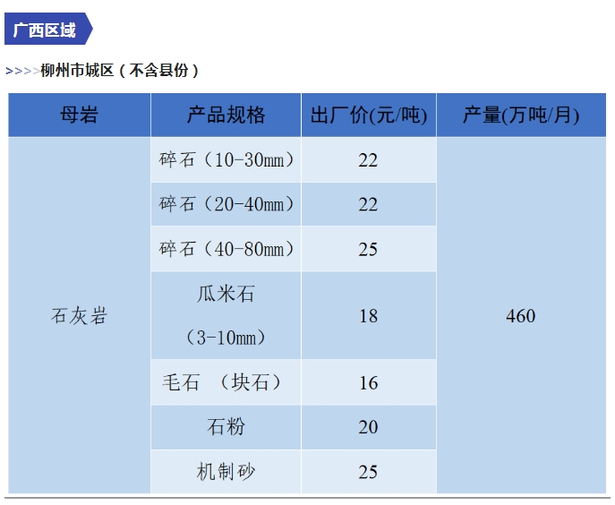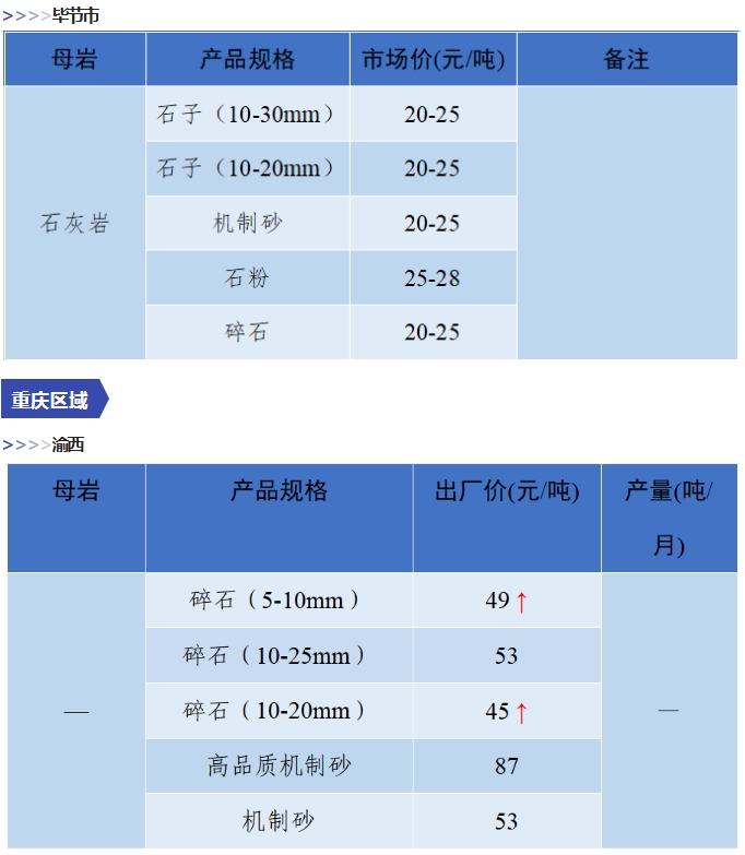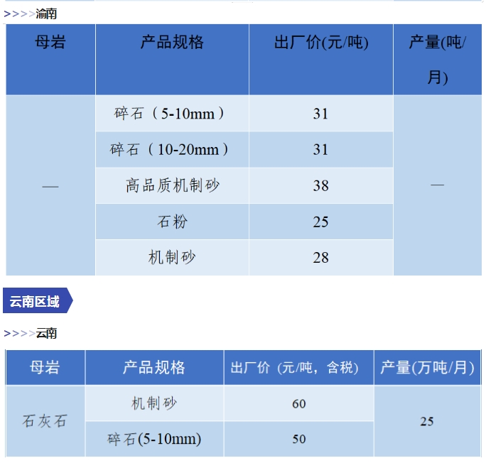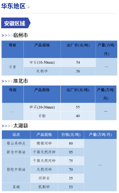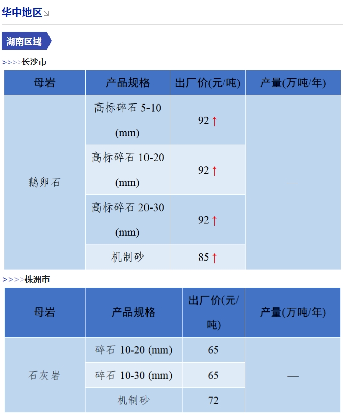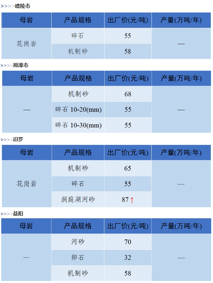 上漲 成都碎石77元/噸,上漲2元/噸,機制砂82元/噸,上漲2元/噸,天然砂82元/噸,上漲2元/噸。 甘肅天水市機制砂72.12(含稅),上漲11元/噸,碎石61.14元/噸,上漲6元/噸。 湖南長沙高標(biāo)碎石92元/噸,上漲3元/噸;機制砂85元/噸,上漲7元/噸。 長江沿線港口機制砂石、洞庭湖、鄱陽湖砂全線上漲,普遍漲幅在2-4元/噸左右。南京港天然砂(洞庭湖砂2.0-3.0)95-104元/噸,上漲5-8元/噸;南通長源(洞庭湖砂2.0-3.0)98-107/噸,上漲5-12元/噸。 下降 重慶渝東碎石(5-10mm)31元/噸,下降2元/噸;碎石(16-25mm)37元/噸,下降3元/噸;機制砂24元/噸,下降3元/噸,高品質(zhì)機制砂33元/噸,下降8元/噸。 重慶渝北機制砂48元/噸,下降6元/噸,高品質(zhì)機制砂54元/噸,下降6元/噸,碎石(5-10mm)45元/噸,下降6元/噸。 溫馨提示:部分價格為相關(guān)企業(yè)代表性價格,不代表當(dāng)?shù)仄骄鶅r格,價格僅供參考。 臨近年關(guān),部分礦山開始停產(chǎn)停運,除大型基建項目趕工外,其他項目已經(jīng)進(jìn)入收尾階段,北方部分項目逐步進(jìn)入“停工”階段,請相關(guān)企業(yè)關(guān)注砂石價格和市場走向,根據(jù)自身實際情況合理安排生產(chǎn)和采購任務(wù)。