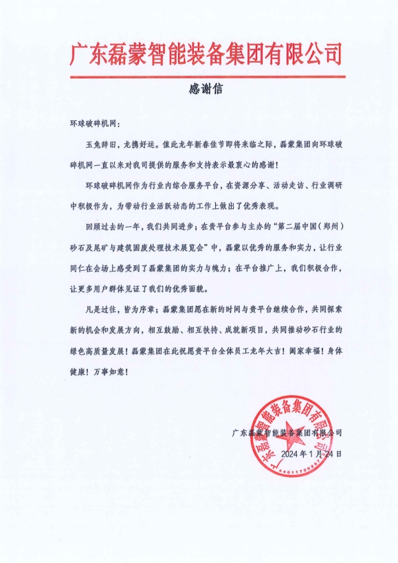 近日,環球破碎機網收到廣東磊蒙智能裝備集團有限公司感謝信。信中,磊蒙集團對環球破碎機網過去一年的工作表示了肯定和感謝。