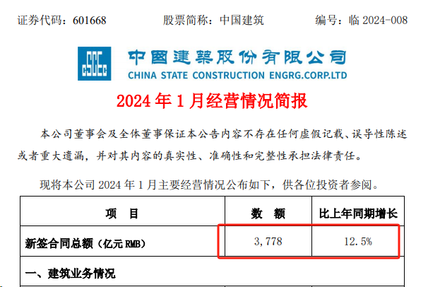 日前,中國(guó)建筑發(fā)布2024年1月經(jīng)營(yíng)情況簡(jiǎn)報(bào)。根據(jù)公告顯示,中國(guó)建筑2024年開(kāi)年頭一個(gè)月累計(jì)實(shí)現(xiàn)新簽合同額3778億元,同比增長(zhǎng)率達(dá)12.5%,給今年的經(jīng)營(yíng)業(yè)績(jī)開(kāi)了一個(gè)好頭。