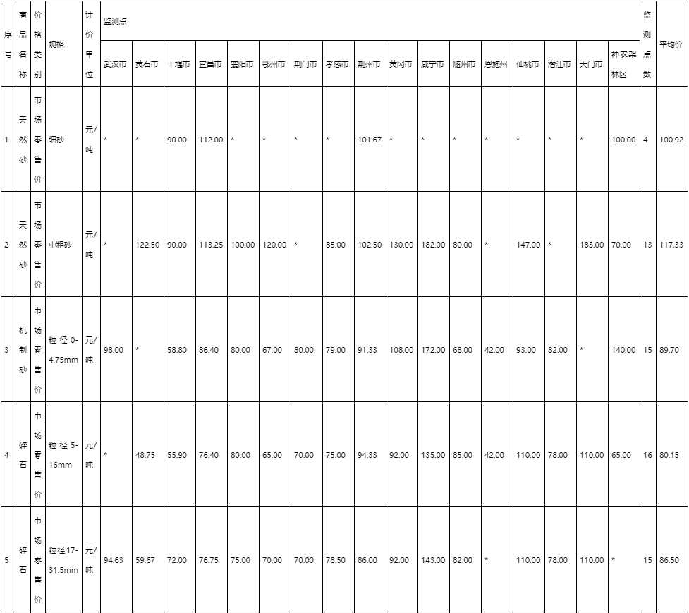 機(jī)制砂咸寧市價(jià)格最高達(dá)172元/噸;恩施州價(jià)格最低42元/噸。