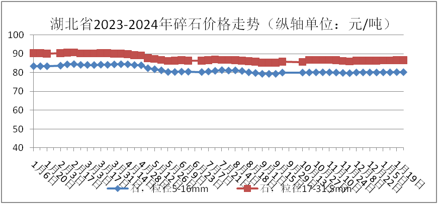 監(jiān)測(cè)數(shù)據(jù)顯示:1月份,碎石(粒徑5-16mm)、碎石(粒徑17-31.5mm)全省均價(jià)分別為80.20元/噸、86.51元/噸,環(huán)比分別上漲:0.22%、0.24%;同比分別下跌:3.85%和4.14%。具體價(jià)格走勢(shì)情況如下圖: