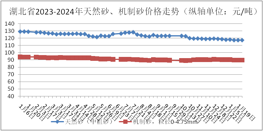 監(jiān)測(cè)數(shù)據(jù)顯示:1月份,天然砂(中粗砂)、機(jī)制砂全省均價(jià)分別為117.52元/噸、89.87元/噸,環(huán)比分別下跌:1.10%、0.66%;同比分別下跌:8.99%、4.42%。具體價(jià)格走勢(shì)情況如下圖: