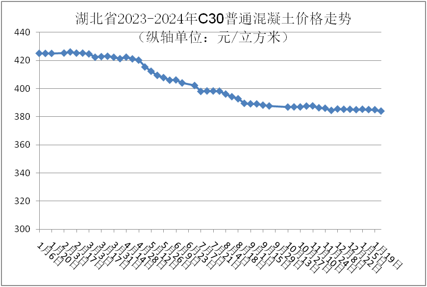 監(jiān)測(cè)數(shù)據(jù)顯示:1月份,強(qiáng)度等級(jí)C30普通混凝土全省均價(jià)為384.72元/立方米,環(huán)比下跌0.07%,同比下跌9.49%。