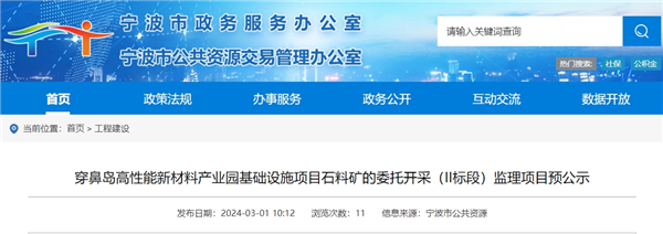 浙江省寧波市公共資源交易管理辦公室發(fā)布了穿鼻島高性能新材料產(chǎn)業(yè)園基礎(chǔ)設(shè)施項目石料礦的委托開采(II標(biāo)段)監(jiān)理招標(biāo)文件預(yù)公示。