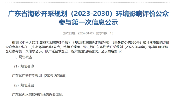 2024年4月3日,廣東省自然資源廳發(fā)布廣東省海砂開采規(guī)劃(2023-2030)環(huán)境影響評(píng)價(jià)公眾參與第一次信息公示,規(guī)劃期限為2023年-2030年,規(guī)劃范圍為廣東省內(nèi)水深50米以淺的近海海域。