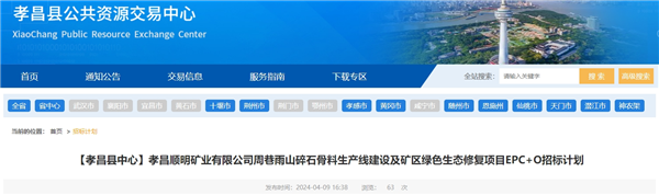 4月9日,湖北省孝昌縣公共資源交易中心發(fā)布孝昌順明礦業(yè)有限公司周巷雨山碎石骨料生產線建設及礦區(qū)綠色生態(tài)修復項目EPC+O招標計劃。