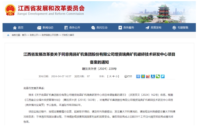 南礦集團(tuán)擬增資瑞典礦機(jī)破碎技術(shù)研發(fā)中心項(xiàng)目1200萬元近日,江西省發(fā)展改革委發(fā)布了《關(guān)于同意南昌礦機(jī)集團(tuán)股份有限公司增資瑞典礦機(jī)破碎技術(shù)研發(fā)中心項(xiàng)目備案的通知》。通知表示,根據(jù)《江西省企業(yè)境外投資管理辦法》(贛發(fā)改外資〔2018〕565號(hào)),對(duì)南昌礦機(jī)集團(tuán)股份有限公司增資瑞典礦機(jī)破碎技術(shù)研發(fā)中心項(xiàng)目予以備案。