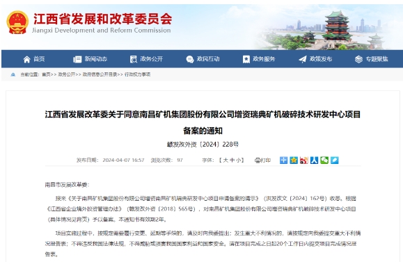 近日,江西省發(fā)展改革委發(fā)布了《關(guān)于同意南昌礦機(jī)集團(tuán)股份有限公司增資瑞典礦機(jī)破碎技術(shù)研發(fā)中心項(xiàng)目備案的通知》。通知表示,根據(jù)《江西省企業(yè)境外投資管理辦法》(贛發(fā)改外資〔2018〕565號),對南昌礦機(jī)集團(tuán)股份有限公司(下稱“南礦集團(tuán)(001360)”)增資瑞典礦機(jī)破碎技術(shù)研發(fā)中心項(xiàng)目予以備案。