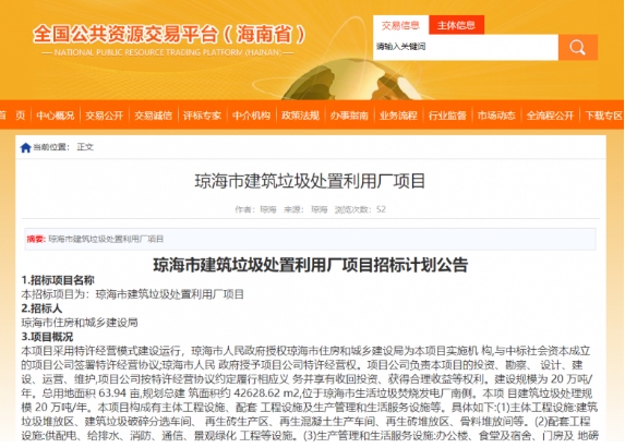 本招標項目為:瓊海市建筑垃圾處置利用廠項目2.招標人