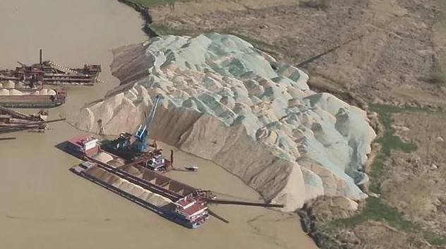 截至督察進駐,相關企業(yè)累計非法采砂1903萬噸,挖空孟姜垸洲灘面積2085畝,近四分之一個孟姜垸洲灘被挖空。現(xiàn)場督察發(fā)現(xiàn),孟姜垸洲灘內堆存砂石約17.6萬噸。