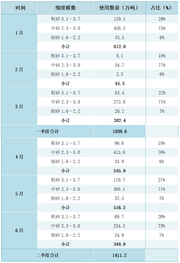 2024年二季度本市建設(shè)用砂使用量1411.2萬噸,環(huán)比一季度增長了35.74%。